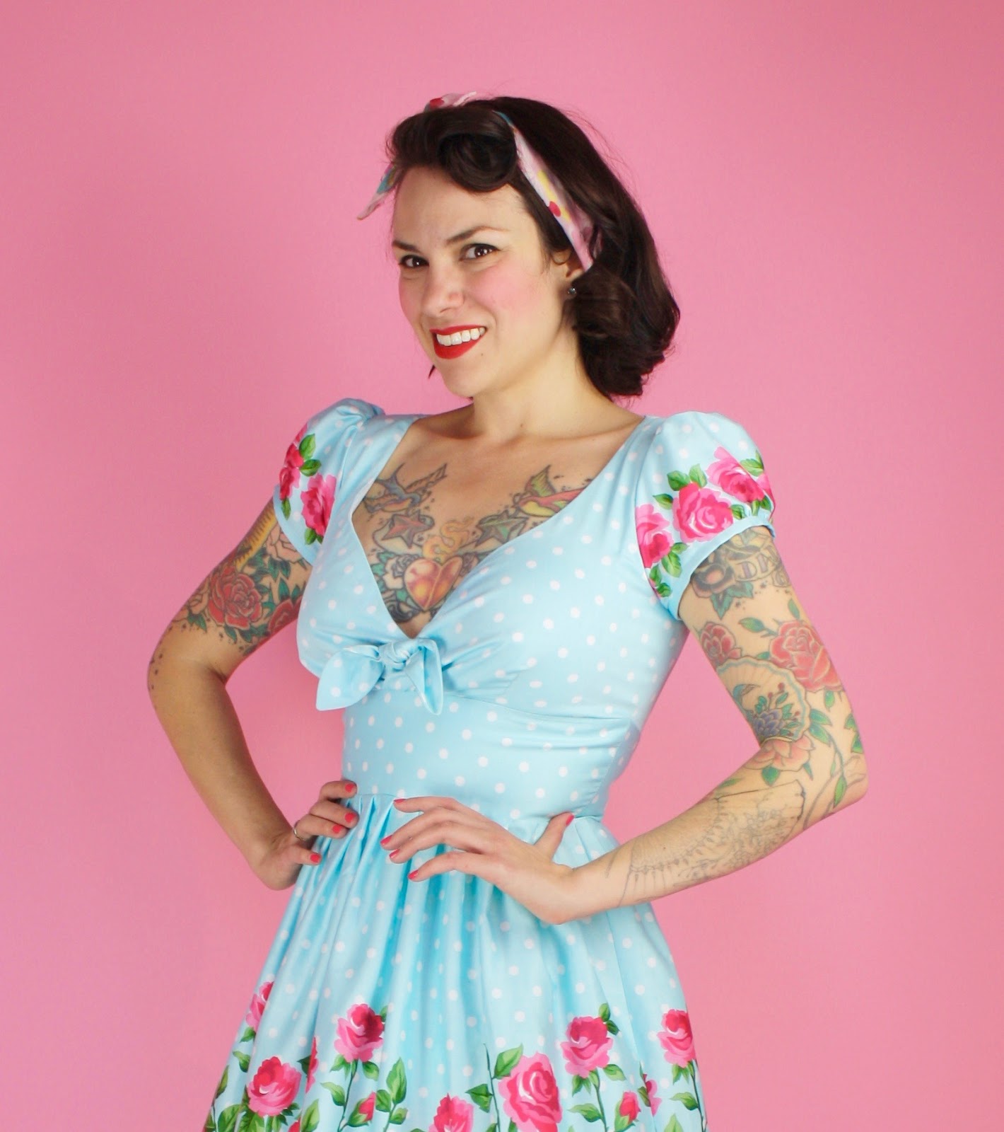 As you can see, there are actually two borders on this fabric! There's a small scale rose border on one selvage, and a big one on the other. This means you can use the different scales for different effects in your garment. For this dress, I decided to use the small border along a puff sleeve and the large border on the skirt.